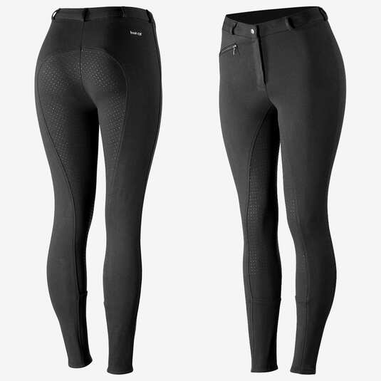 Dámské moderní rajtky s protiskluzovým gripem v oblasti celého sedu a s elastickým zakončením nohavic. Kapsa vpředu na zip.