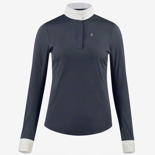 Příjemné dámské závodní tričko s dlouhým rukávem, vyrobené z lehkého funkčního materiálu, který je prodyšný a rychle schne. Bílý stojáček, zapínání u krku na cvočky.