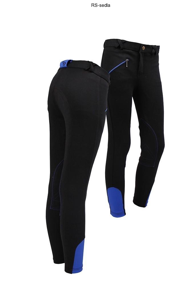 Dětské jezdecké rajtky. - kontrastní prošití- látkové vyztužení na kolenou- vpředu vpravo kapsa na zip s kontrastní páskou- v zadní části zkřížená poutka na opasek v kontrastní barvě s výšivkou QHP K dispozici jsou ve více barevných kombinacích. Materiál: 95% bavlna, 5% LycraBarvy: modrá, růžová, tm... celý popis