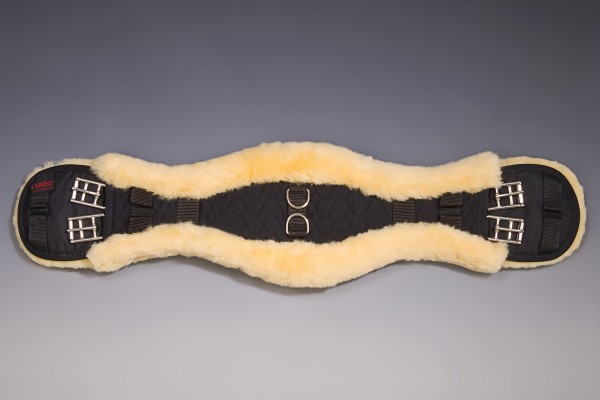 Anatomický drezurní podbřišník podložený pravým beránkem nejvyšší kvality od Německé značky Christ Lammfelle. Podbřišník je vyrobený z textilního materiálu - středová část je vyrobená z příjemné a prodyšné bavlny, exponované části pod přezkami jsou vyrobeny z pevného nylonu pro maximální pevnost a trvanlivost. Podbřišník je vhodný i pro citlivé koně.