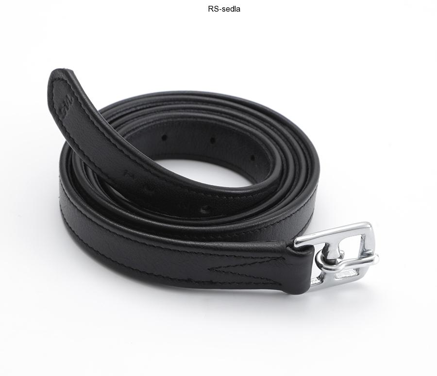 Třmeny vyrobeny z vysoce kvalitní kůže, mají hladký povrch a elegantní vzhled. Šířka řemenu je 2,5cm, má dvojité  prošívání, 12 očíslovanýchi otvorů, spony z nerezové oceli. Ideální pro každého jezdce bez ohledu na zvolenou jezdeckou disciplínu. Černá nebo tmavě hnědá barva, velikosti 135cm nebo 14... celý popis
