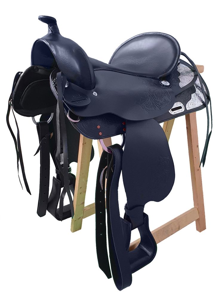 Westernové bezkostrové sedlo - bohatě zdobené z buvolí kůže, posedlí je vyměkčené a potažené hladkou kůží, sedlo je vhodné pro široké koně, rozteč mezi conchy přední komory je 24cm, sedlové polštáře lze posouvat díky suchým zipům.