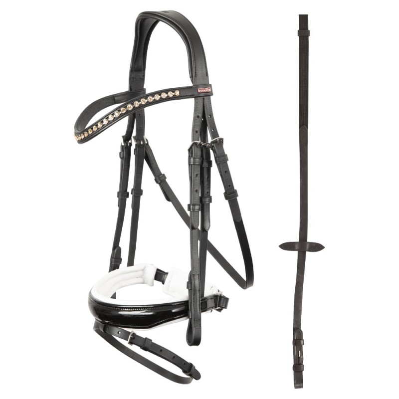 Uzdečka Premiere Brest je vyrobena z měkké, poddajné kůže a je anatomicky tvarovaná. Skvěle padne koni zajišťuje a je optimálně pohodlná. Anatomicky tvarovaná čelenka má měkkou podšívku se středně měkkým polstrováním a za ušima je vykrojená. Nánosník je také anatomicky tvarovaný a je opatřen měkce polstrovanou zvýšenou podšívkou. Uzdečka má luxusní vzhled díky lakovanému nánosníku a anatomické čelence s kamínky. Dodává se s protiskluzovými otěžemi se zarážkami.