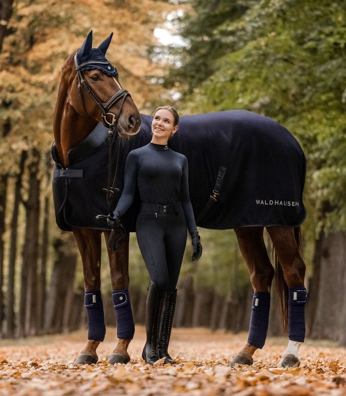 Elegantní fleecová deka s měkce polstrovaným límcem v oblasti kohoutku a krku. Fleecová  deka je z vysoce kvalitního materiálu, který  nežmolkovatí a zajišťuje optimální funkci odvádění potu. S tónovanou ozdobnou paspulkou a třpytivým waldhausenským nápisem.