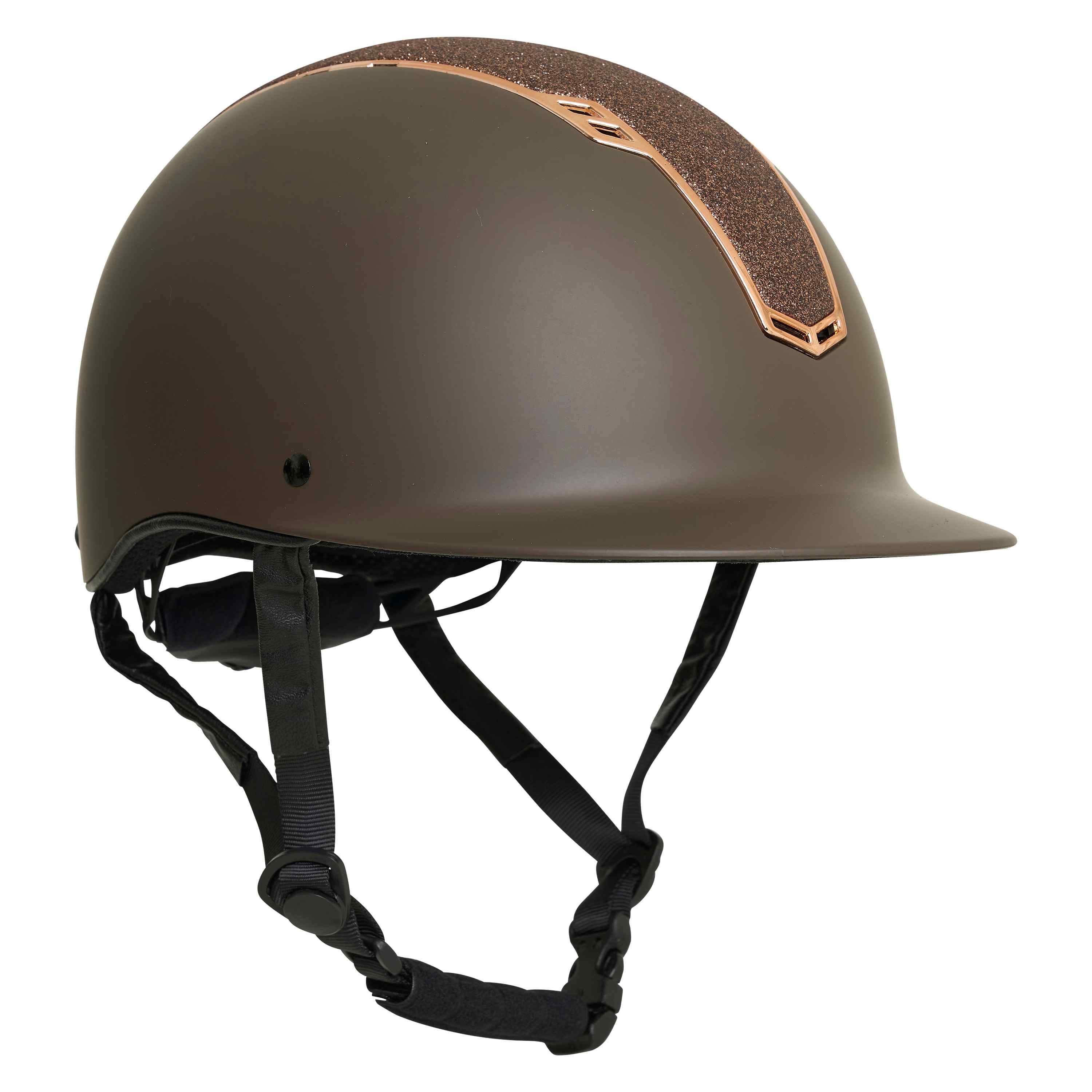 Nastavitelná jezdecká přilba v lehké skořepině z pevného materiálu ABS. S orámovanou třpytivou deskou a 9 větracími otvory na každé straně pro zajištění maximálního větrání. Helma je dodávána s odnímatelnou a omyvatelnou vnitřní podšívkou vyrobenou z měkkého mirco fleecu pro větší pohodlí. Ovládací knoflík se snadno nastavuje a zajišťuje dokonalé uchycení. Bezpečnostní norma EU CE VG1 01.040 2014-12.