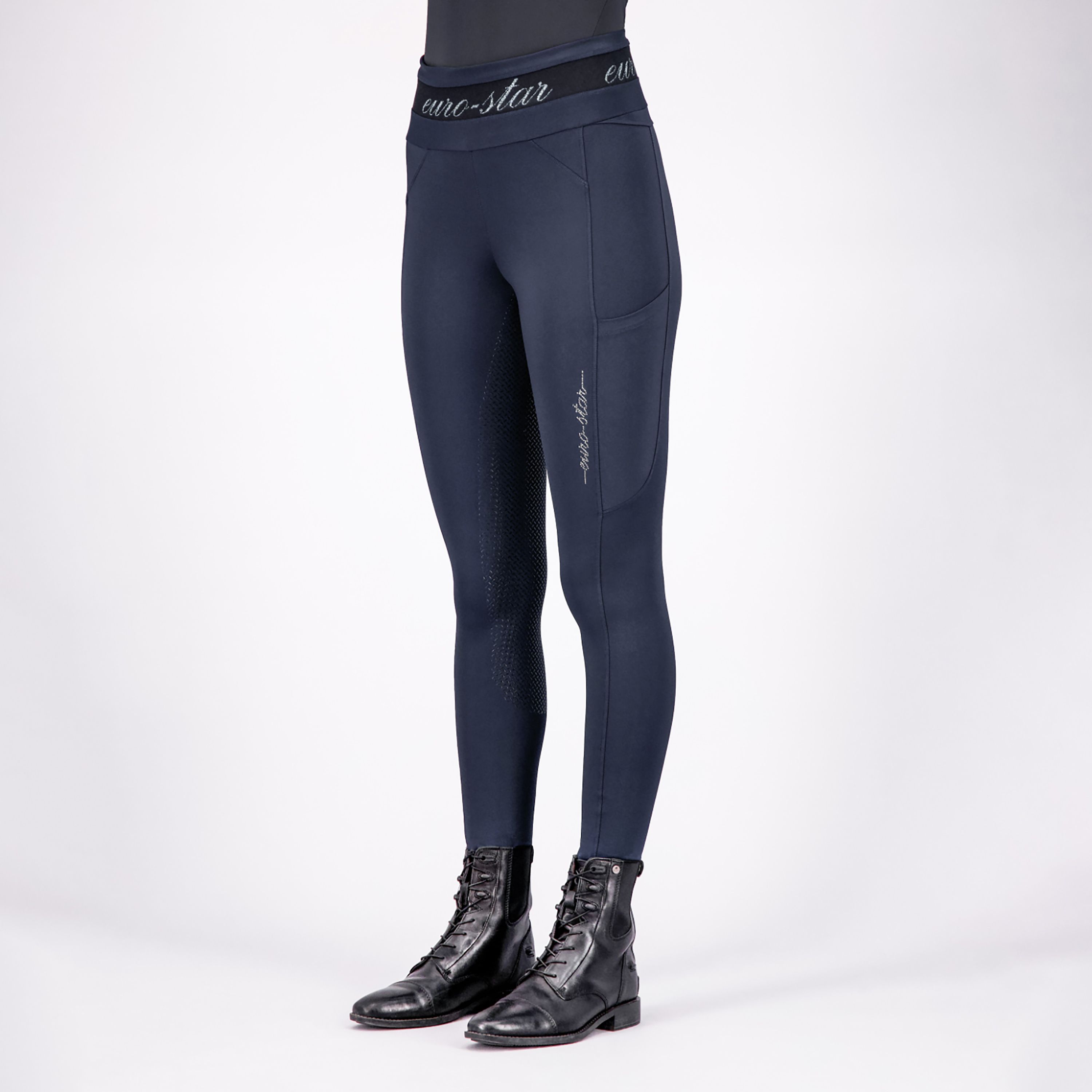 Jezdecké legíny ARES.Vysoký pas * Velmi pohodlný, měkký a podpůrný pas * Logo z kamínků na levé noze * Kapsy na telefon na obou stranách * Falešné kapsy vpředu - silikonový grip po celém seduMateriál: 75% polyamid, 25% elastanBarva: navy, šedá, černáVelikosti: 36, 38, 40, 42, 44 celý popis