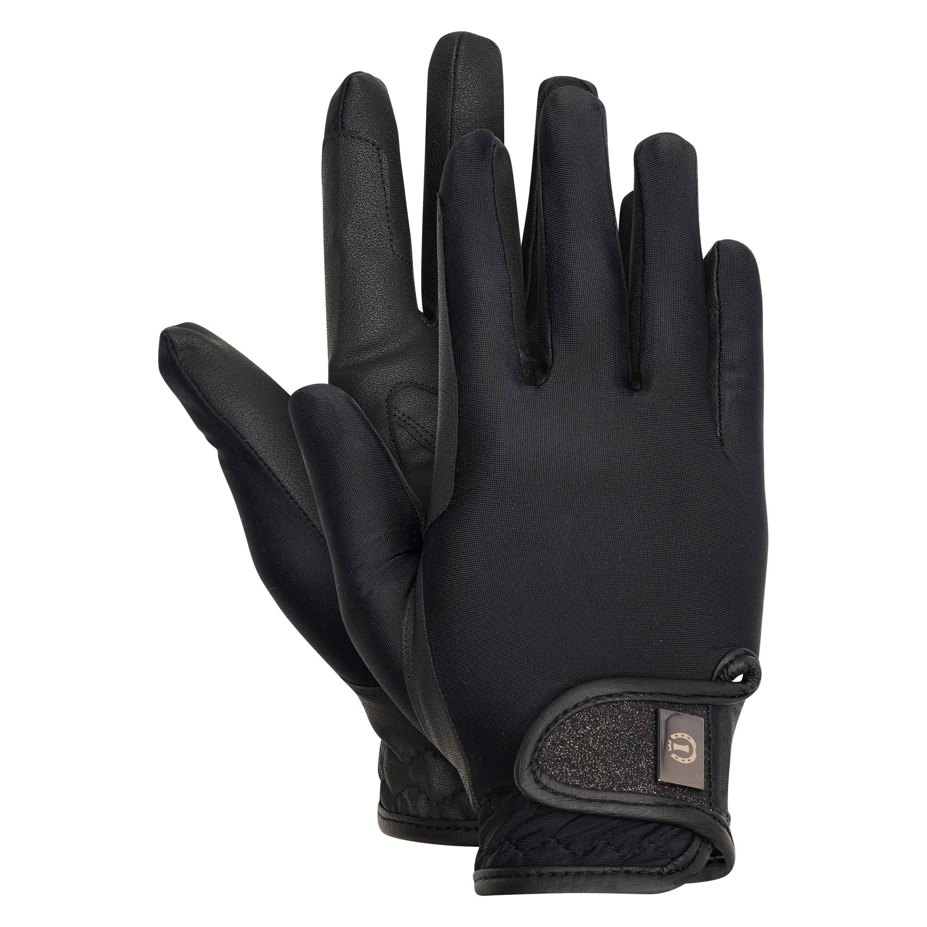 Jezdecké rukavice TIMELESS.Prodyšné * rychleschnoucí * dlaň z umělé kůže * elastické kolem zápěstí * velcro zapínání * zapínání zdobeno třpytkama Materiál: dlaň: 51 % polyamid, 49 % polyuretan                horní část: 82 % polyamid 18 % elastanBarva: na... celý popis