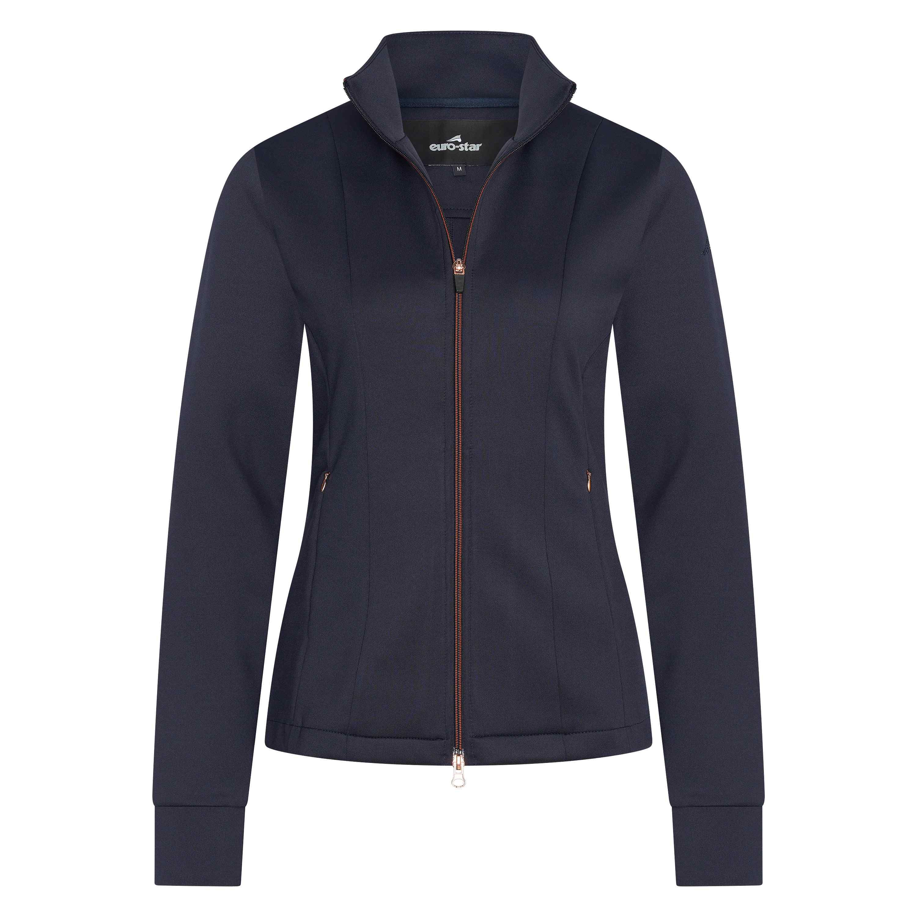Mikina ESMA.- stretch mikina dobře kopírující tělo - 2-cestný zip- kapsy se skrytým zipem - logo s kamínky na rukávu - na límci zdobení z kamínků Euro-starMateriál: 93% polyamid, 7% elastanBarva: navy, červená, světle modrá, černáVelikosti: XS, S, M, L, XL celý popis