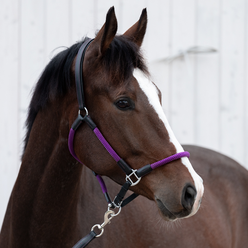 Elegantní ohlávka s koženým nátylníkem v kombinaci s barevným lanem. Ohlávka včetně vodítka s klasickou karabinou.