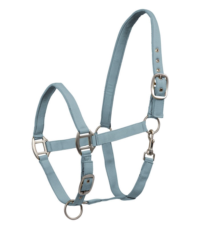 Hladká ohlávka s jemně lemovaným nánosníkem a nátylníkem. Možnost více poloh nastavení nánosníku a nátylníku. Pevné, matně zbarvené kování.