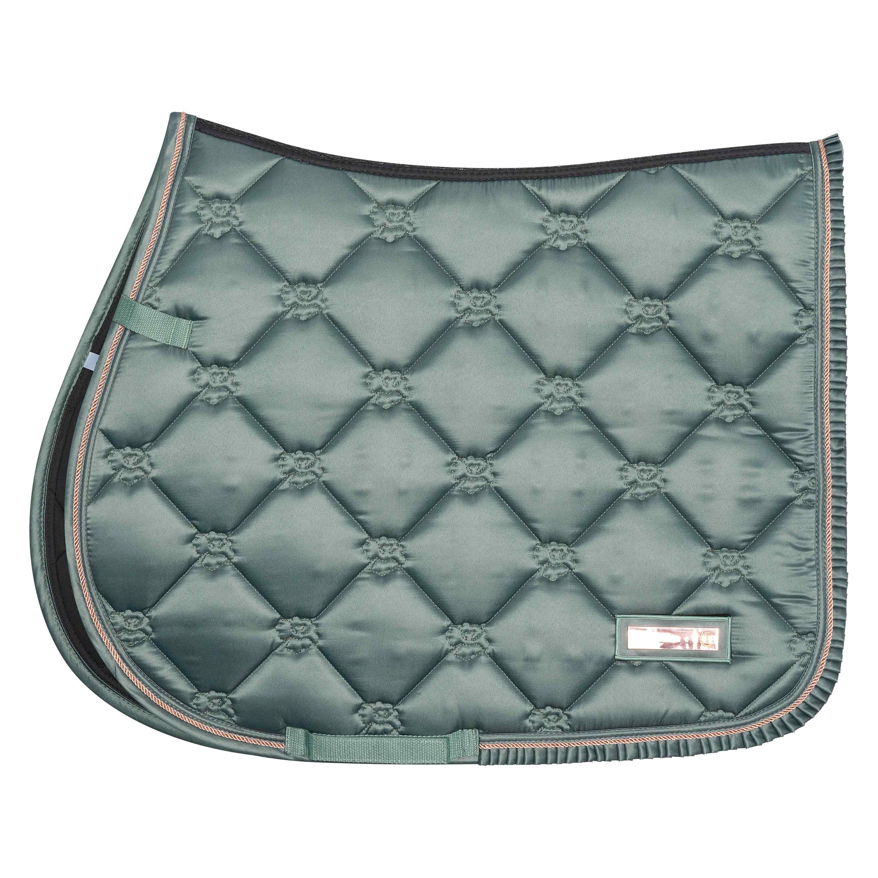 Elegantní podsedlová deka s královským prošíváním, s technickou podšívkou pro extra odvod vlhkosti. Kovový znak na levé straně. Královská volánková vazba po okraji deky.