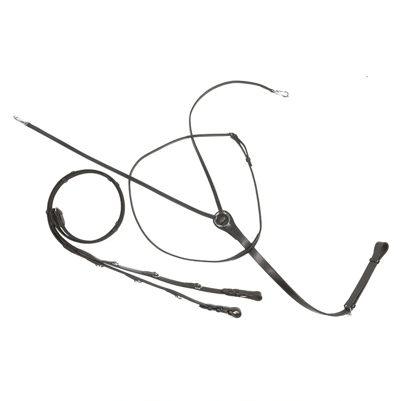 Thiedemann kombinace martingalu a otěží s karabinami. Vyrobeno z velmi kvalitní ploché kůže. Otěže na každé straně se 3 polokroužky.