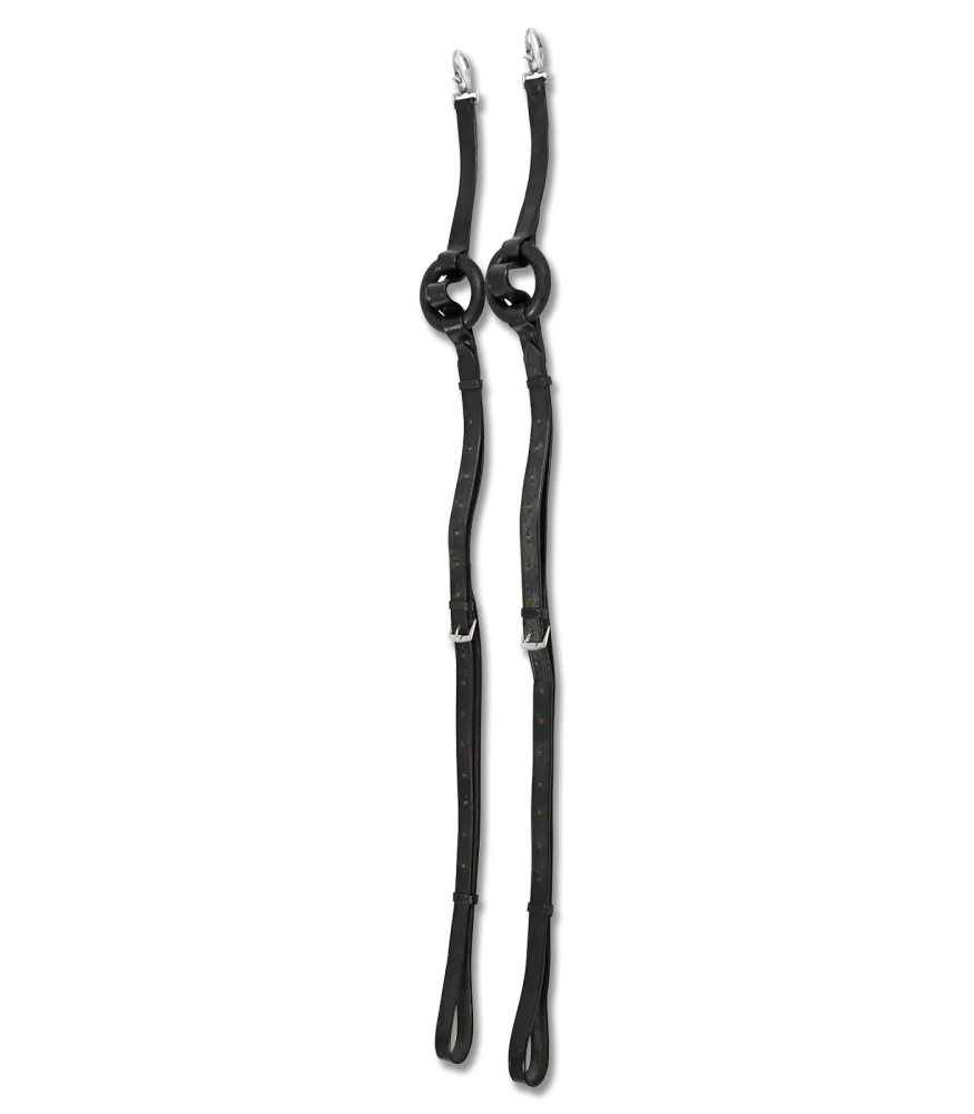 Jeden pár kožených vyvazovacích otěží s gumovým kolečkem.