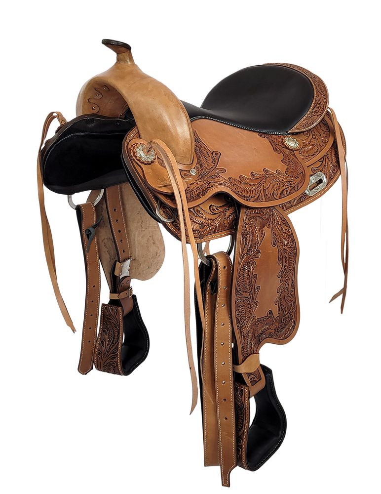 Westernové bezkostrové sedlo - bohatě zdobené z buvolí kůže, posedlí je vyměkčené a potažené hladkou kůží, sedlo je vhodné pro široké koně, rozteč mezi conchy přední komory je 24m, sedlové polštáře lze posouvat díky suchým zipům.